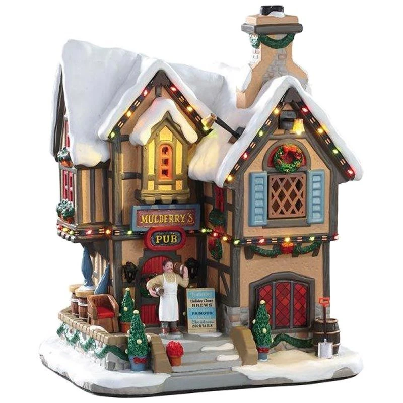 - Lemax Mulberry’s Pub- a lighted building that belongs to the Lemax Caddington Village Collection.